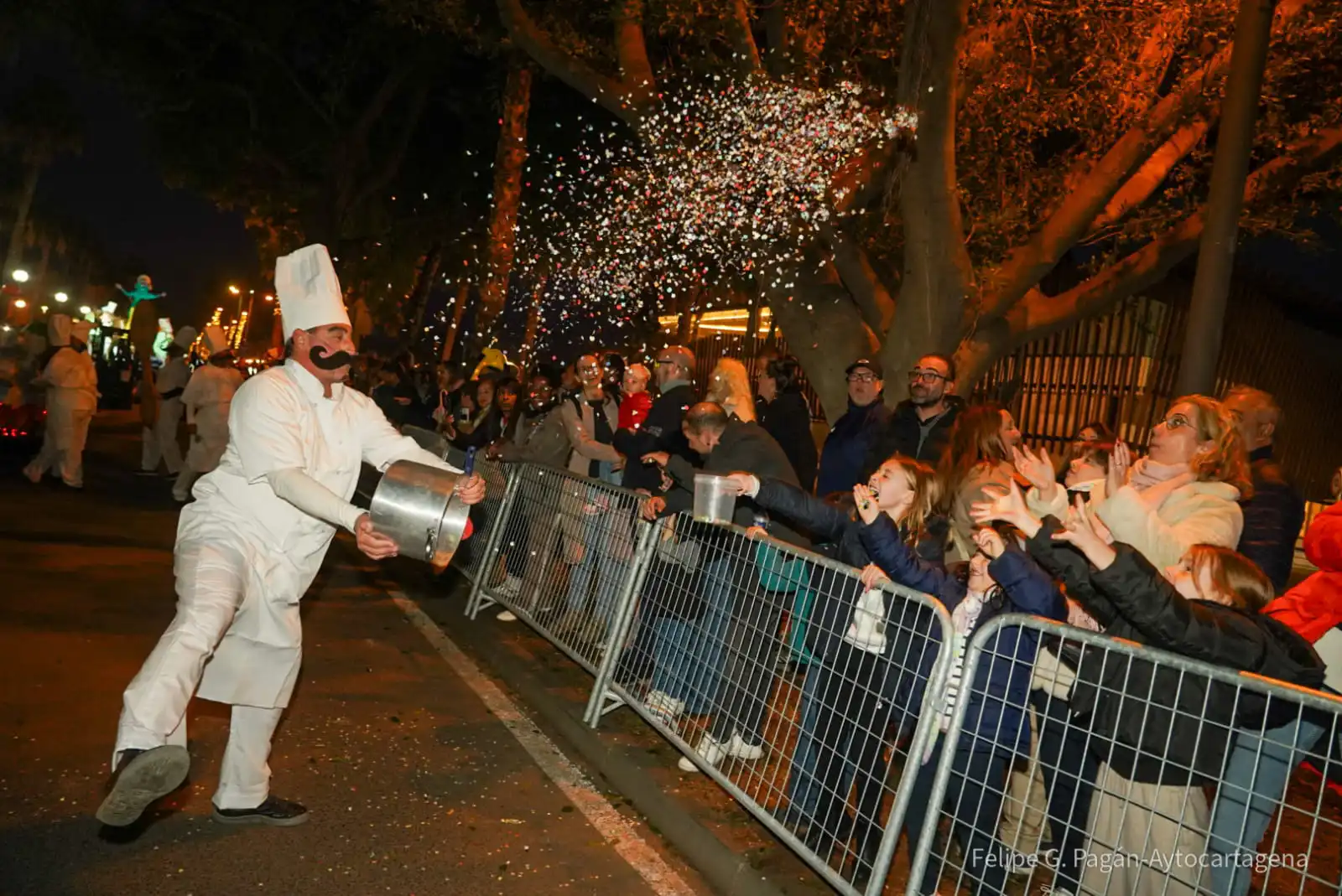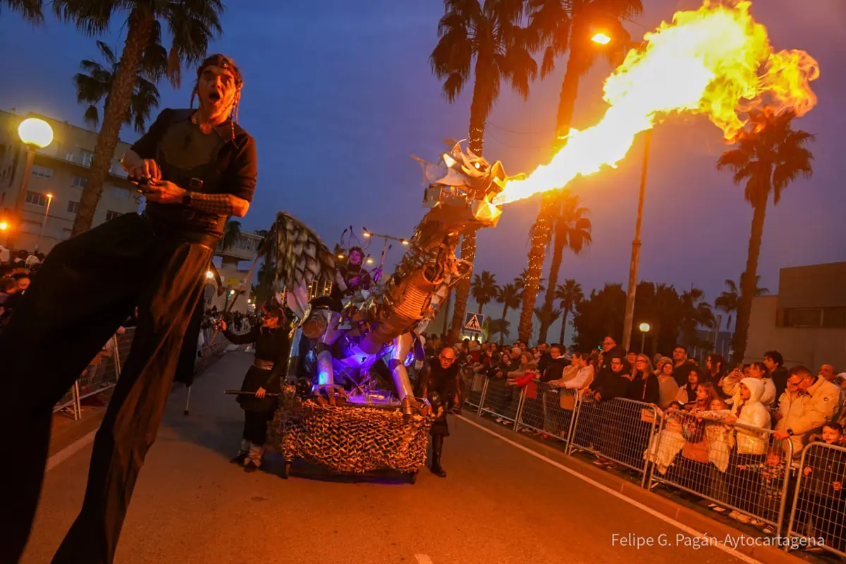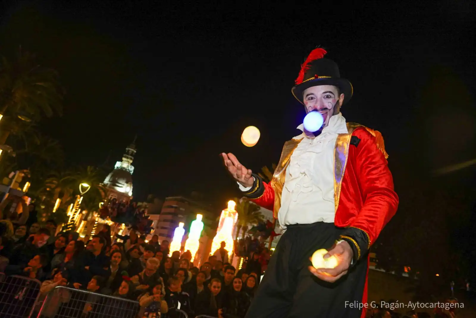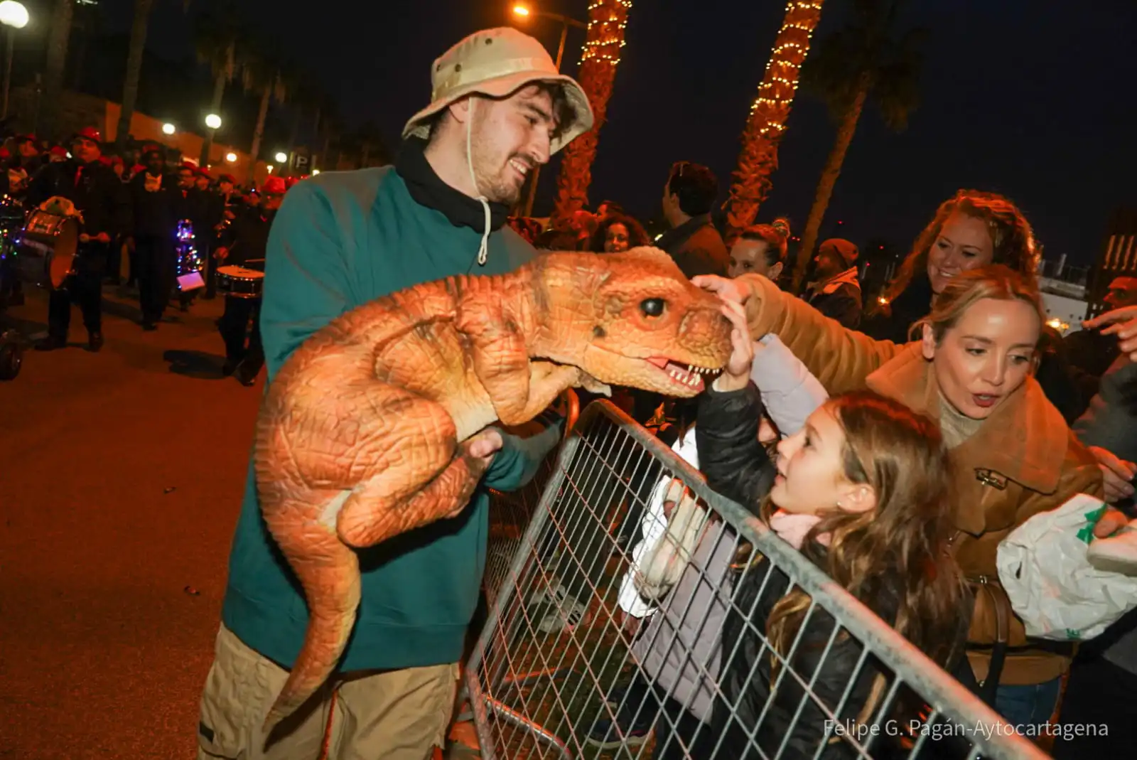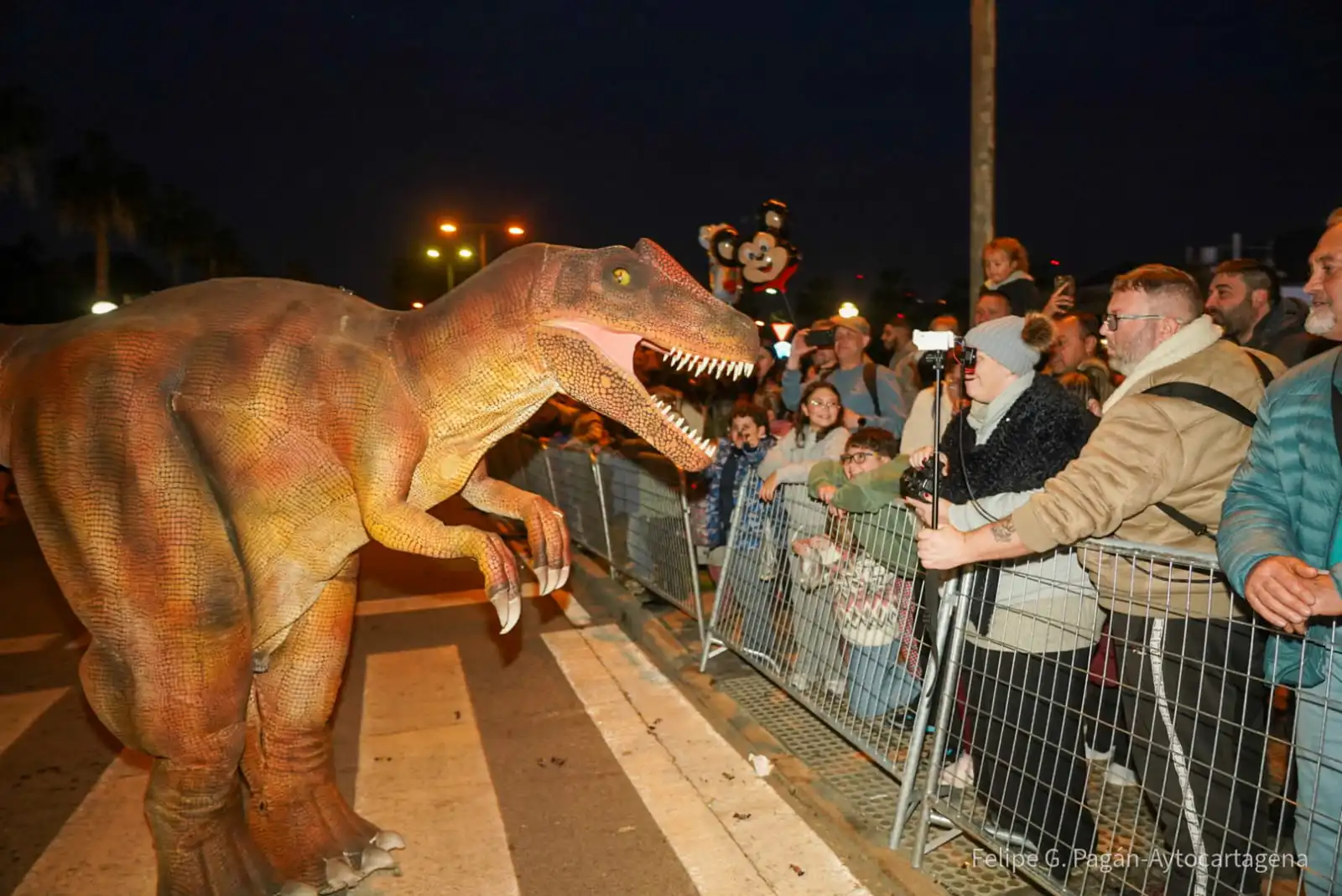Entre las carrozas más aplaudidas figuraron Magic Circo, evocando el circo clásico; la carroza LEGO, con personajes del popular universo; y recreaciones de Aladdín, Jurassic Park y Ratatouille, que conectaron de lleno con el público infantil. Junto a ellas, las carrozas de seda y luz como La Selva, El Señor del Tiempo o Primavera aportaron un componente más artístico y onírico, reforzando el carácter espectacular y participativo de la cabalgata cartagenera.