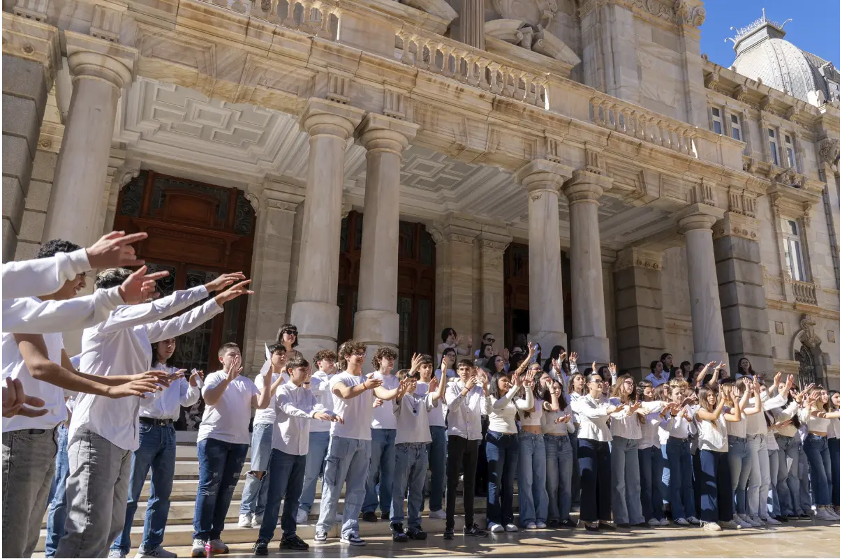 Bajo el cielo abierto del corazón histórico de Cartagena, los estudiantes interpretaron conjuntamente diferentes canciones en una imagen que trascendía lo estrictamente musical. Allí, frente al Palacio Consistorial, las voces se entrelazaban con naturalidad, como si siempre hubieran ensayado juntas. Sin embargo, detrás de esa armonía había kilómetros recorridos y meses de trabajo en común.