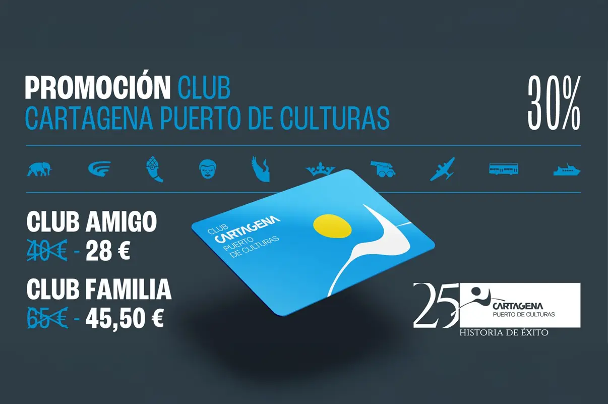 Ahora, con motivo de su 25 aniversario, la entidad quiere que la celebración tenga un marcado acento local. Hasta el próximo mes de abril, quienes deseen sumarse al Club Amigo o al Club Familia podrán hacerlo con un 30% de descuento. Una oportunidad que permitirá disfrutar durante un año completo de acceso ilimitado a los museos y centros gestionados por Cartagena Puerto de Culturas, además del Ascensor Panorámico, convirtiendo la cultura en un hábito y no en una cita puntual.
