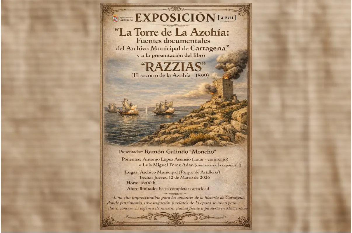 Cartagena volverá la mirada hacia su pasado marítimo este jueves 12 de marzo a las 18:00 horas con la inauguración de una exposición que conecta historia, patrimonio y memoria colectiva. El Archivo Municipal abre sus puertas para presentar La Torre de La Azohía: fuentes documentales del Archivo Municipal de Cartagena, una muestra que sumerge al visitante en el sistema defensivo que protegió durante siglos el litoral cartagenero frente a la amenaza constante de la piratería mediterránea.