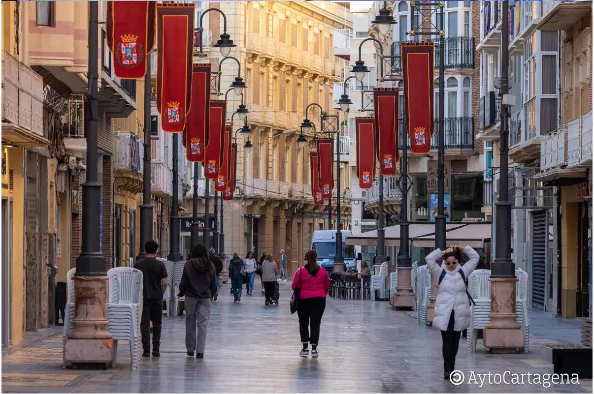Esta actuación se suma a otras que ya han transformado Cartagena en las últimas semanas. Más de 30.000 flores han sido distribuidas no solo en el casco histórico, sino también en barrios y diputaciones, ampliando el ambiente festivo más allá del centro. A ello se añade el reparto de medio millar de banderolas con los escudos de las cofradías, una iniciativa desarrollada junto a la Asociación de Mujeres Cofrades que invita a los propios vecinos a participar activamente en el embellecimiento de sus hogares.