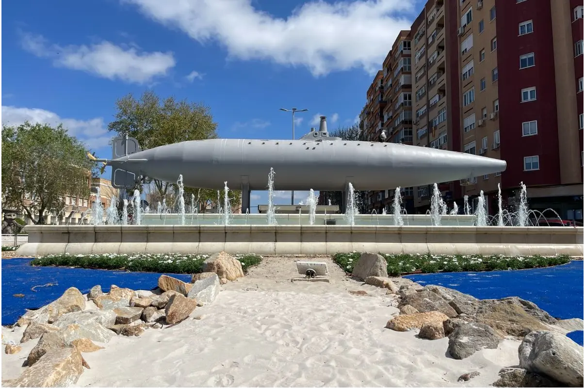 La actuación ha incluido la retirada del antiguo recubrimiento de cristal azul, que había perdido funcionalidad y estética con el paso del tiempo. Sobre el terreno, se ha llevado a cabo un proceso de nivelación mediante arena de sílice, seguido de la instalación de una malla antihierba que garantiza la durabilidad del conjunto. La superficie resultante se ha cubierto con césped artificial de tonalidad azul, una elección que recrea visualmente el mar y envuelve al submarino en un entorno más sugerente.