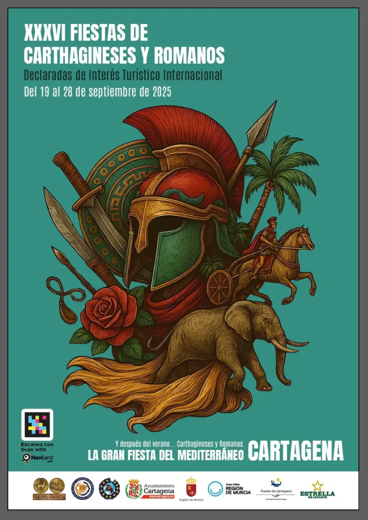 El cartel oficial de las Fiestas 2025, obra de la joven artista Noelia González Sáez, refleja perfectamente el espíritu de esta edición. Sobre un fondo verde mediterráneo destaca la imagen de un casco romano junto a un escudo cartaginés, entrelazados como símbolo de la dualidad histórica de la ciudad. También aparecen una rosa roja y hojas de palmera que evocan la fertilidad y el paisaje local, mientras que en la parte inferior un imponente elefante de guerra acompaña a una cuádriga romana en plena carrera. Estos elementos, cargados de simbolismo, representan la confrontación y a la vez el legado común de las dos civilizaciones, bajo el lema promocional “La Gran Fiesta del Mediterráneo”, con el que Cartagena invita al mundo a sumarse a la celebración. El cartel anuncia las fechas del 19 al 28 de septiembre de 2025, y por primera vez incluye un código NaviLens –visible en la esquina– que permitirá a cualquier persona escanearlo para obtener información accesible sobre la programación.