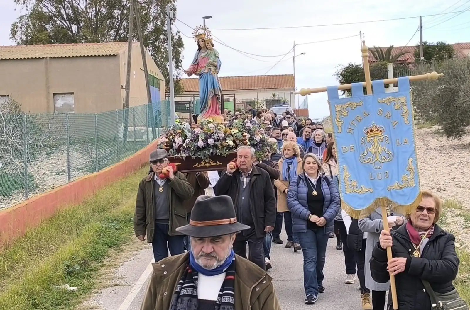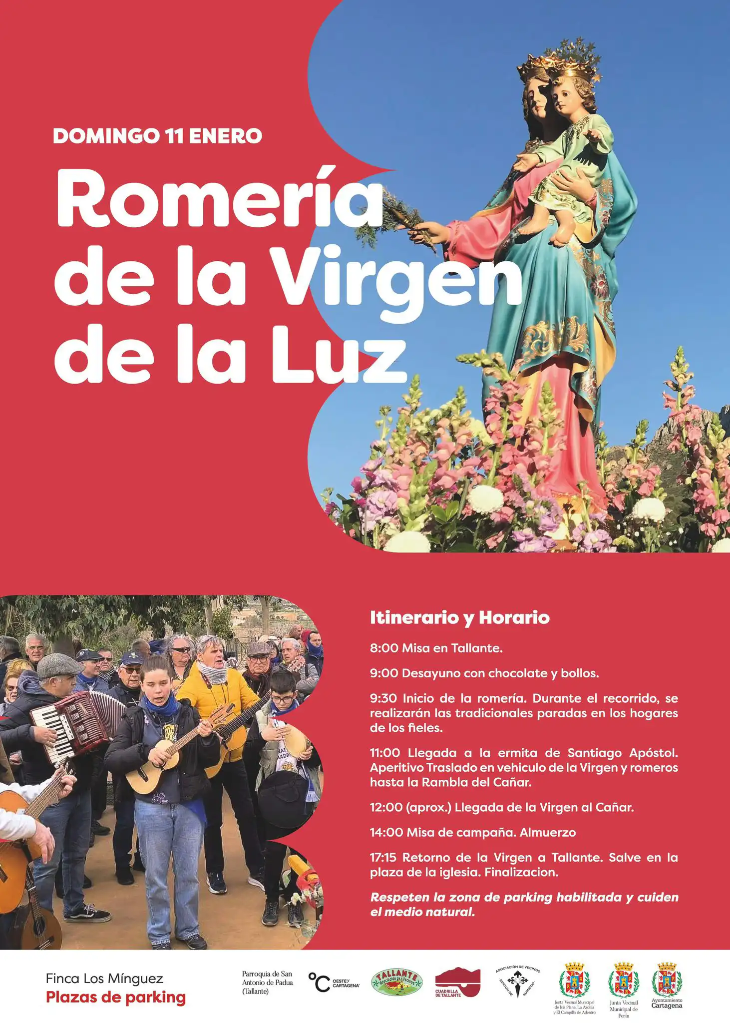 A las 12 del mediodía está prevista la llegada de la Virgen de la Luz a la Finca Los Mínguez, donde se encuentra la histórica y antiquísima ermita. Una vez allí, empezarán los Cantes de Pascua y los bailes por parte de las Cuadrillas de Tallante, Isla Plana, Perín y Balsicas.