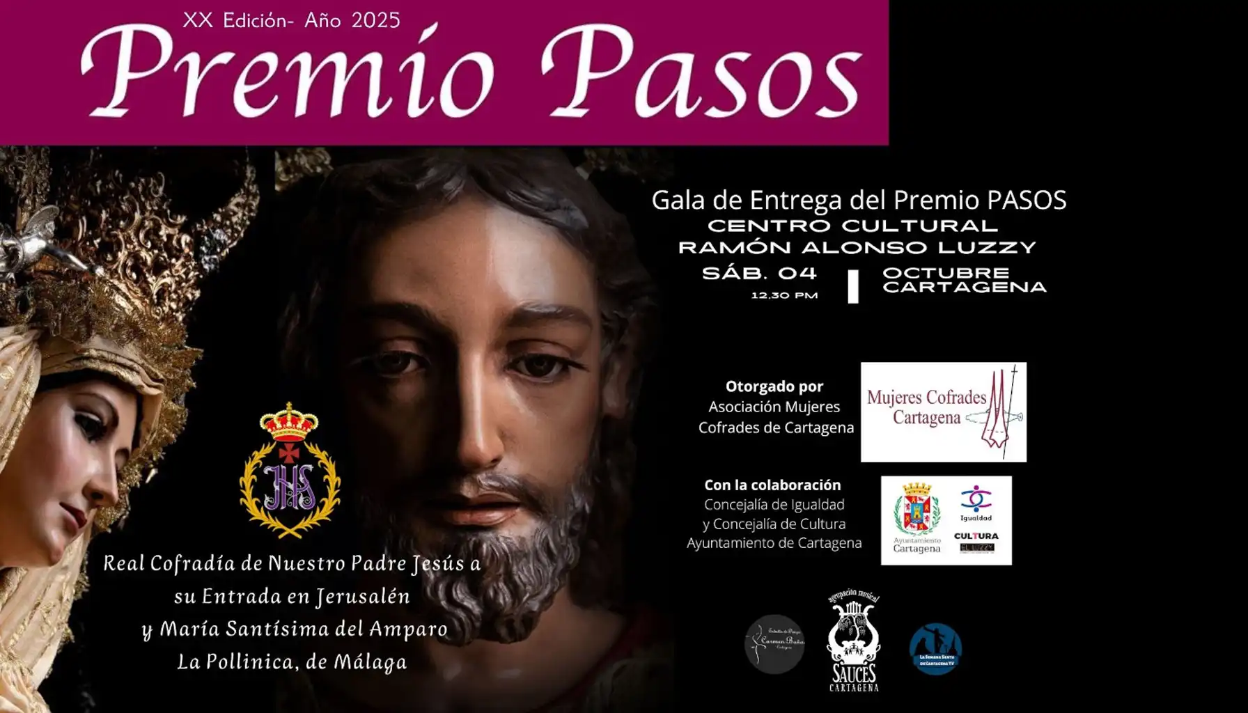 La Asociación Mujeres Cofrades de Cartagena celebra este sábado 4 de octubre, a las 12:30 horas, en el Centro Cultural Ramón Alonso Luzzy, la XX Gala del Premio PASOS, un galardón que cumple 20 años como referente nacional en la defensa de la igualdad en el ámbito cofrade.