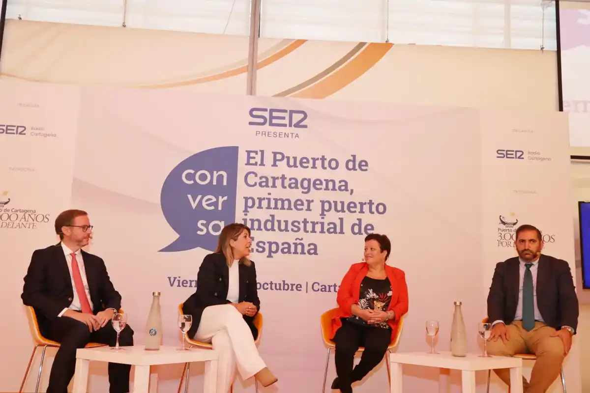 Empresas e instituciones avalan al puerto de Cartagena como motor económico de la Región durante el Foro Conversa que ha organizado en la ciudad la Cadena SER este 17 de octubre para ensalzar a Cartagena como primer puerto industrial de España. Han tomado la palabra la alcaldesa Noelia Arroyo, el presidente de la Autoridad Portuaria, Pedro Pablo Hernández, y el presidente de la Comunidad Autónoma, Fernando López Miras. Los tres dirigentes han coincidido en destacar la relevancia del puerto como motor de progreso, empleo y sostenibilidad. En resumen, la alcaldesa ha defendido un puerto más grande, mejor conectado y sostenible. El dirigente portuario ha destacado el liderazgo del puerto a nivel mundial y su compromiso con el crecimiento logístico y la conservación del entorno. Y el presidente autonómico ha hecho un análisis global del peso histórico de la ciudad en la economía regional.