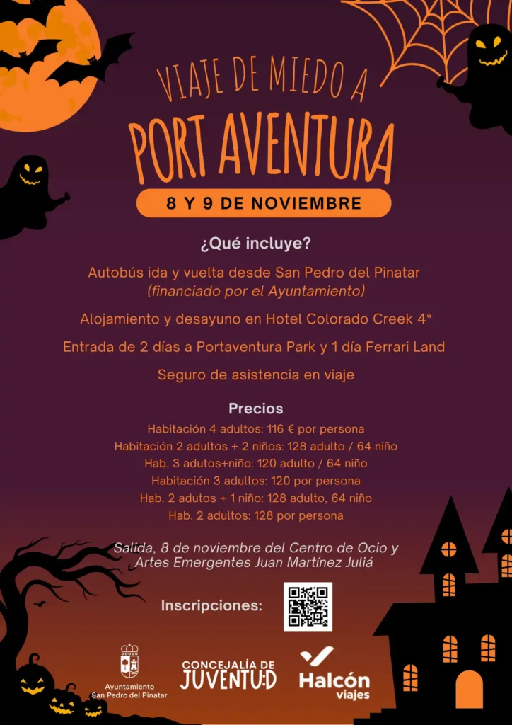 La concejalía de Juventud de San Pedro del Pinatar organiza un año más un viaje dirigido a jóvenes y familias para disfrutar del parque de atracciones PortAventura con motivo de la festividad de Halloween.