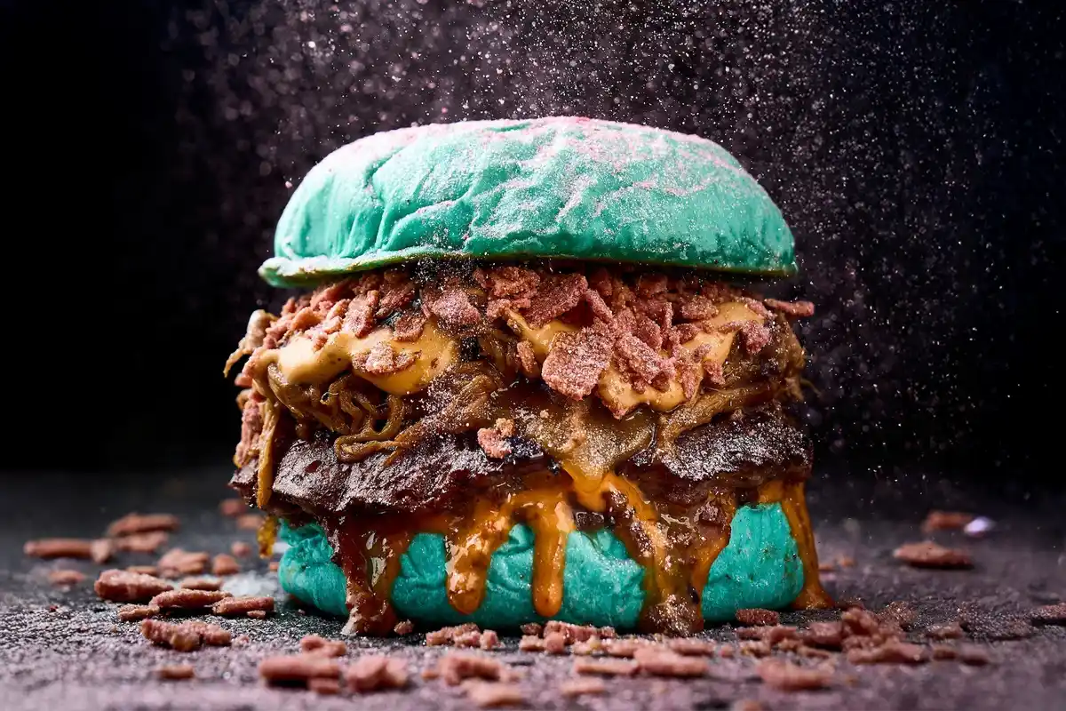 La propuesta de Nolito’s no ha pasado inadvertida en ningún punto de la ruta. Pan brioche azul con polvo de diamante y oro rosa, un fat smash madurado de carne prémium, costilla al estilo americano, mermelada de beicon, chédar, beicon crujiente, mayonesa ahumada y salsa especial Emmy. Una combinación atrevida, visual, casi teatral, que ha conquistado al público desde el primer mordisco.