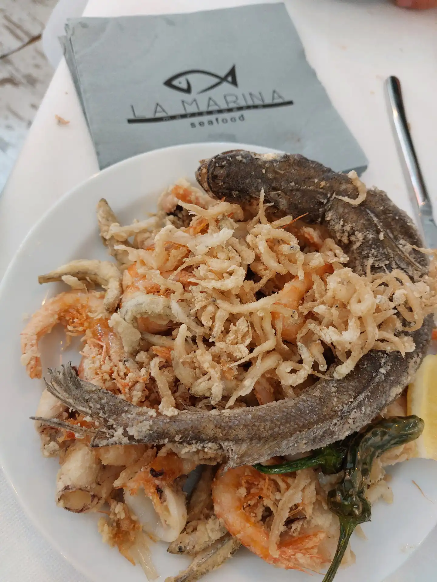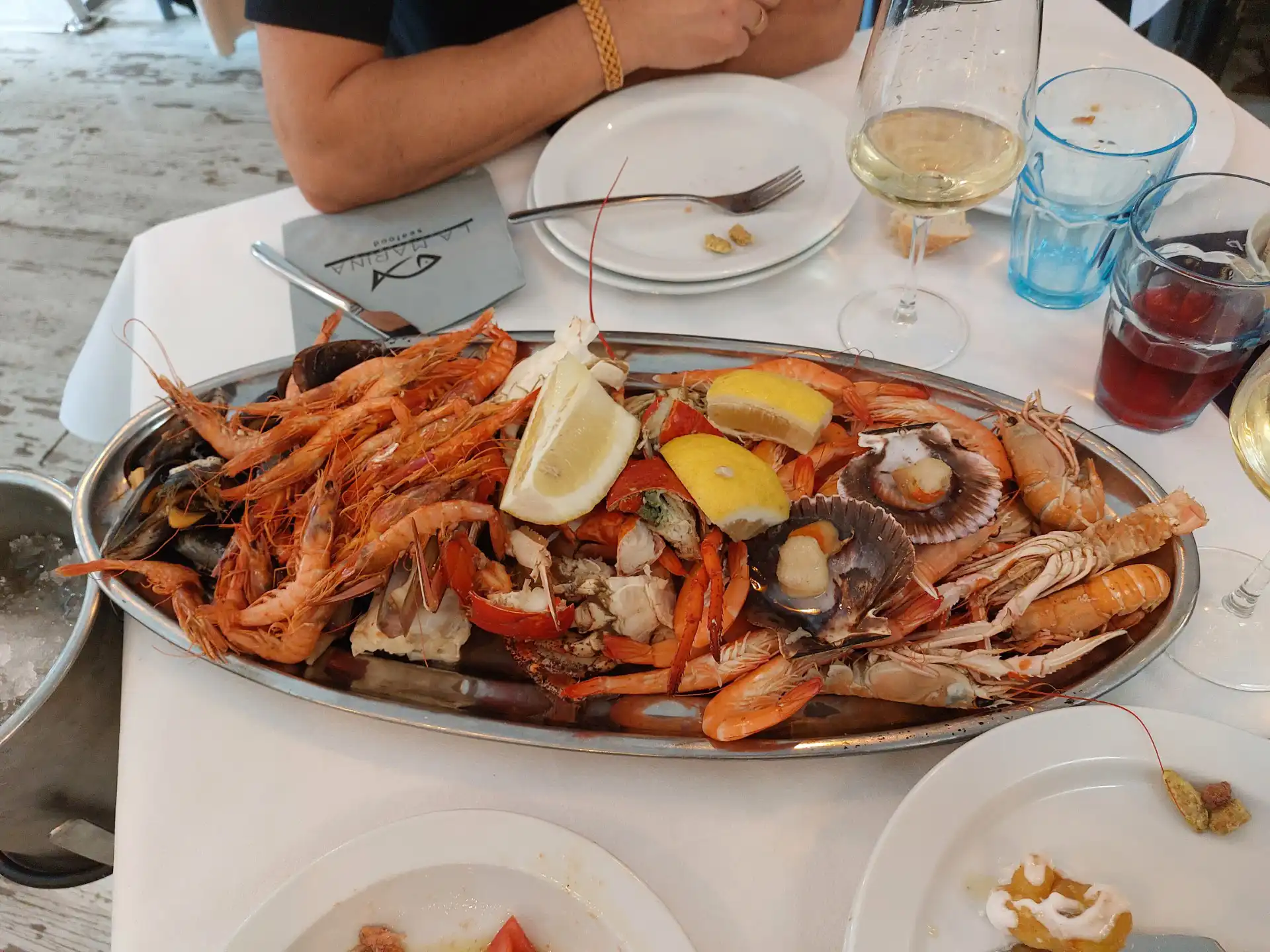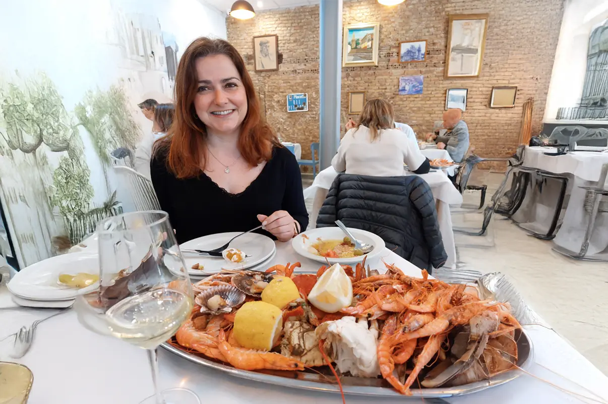 Y lo fue. Desde los primeros platos, quedó claro que aquello no iba a ser una comida cualquiera. La abundancia era tal que resultaba difícil imaginar el final. Marisco fresco, bien presentado, con ese punto justo que marca la diferencia entre lo correcto y lo excelente. Gambas, cigalas, almejas, frituras… una sucesión de platos que llegaban a la mesa sin descanso, en una cadencia que invitaba tanto a disfrutar como a rendirse ante la evidencia: era imposible terminarlo todo.