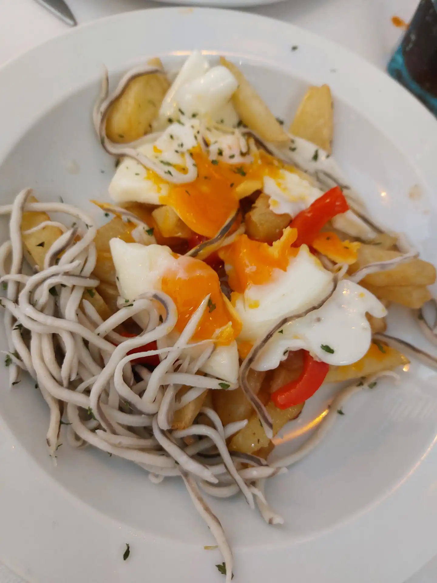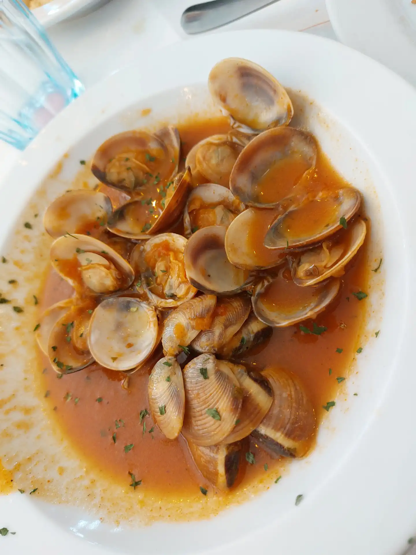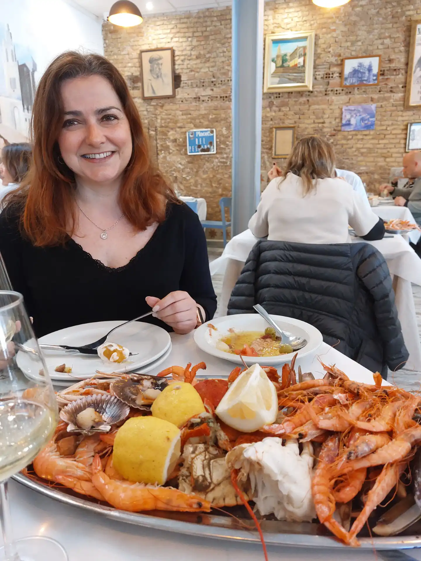 Y lo fue. Desde los primeros platos, quedó claro que aquello no iba a ser una comida cualquiera. La abundancia era tal que resultaba difícil imaginar el final. Marisco fresco, bien presentado, con ese punto justo que marca la diferencia entre lo correcto y lo excelente. Gambas, cigalas, almejas, frituras… una sucesión de platos que llegaban a la mesa sin descanso, en una cadencia que invitaba tanto a disfrutar como a rendirse ante la evidencia: era imposible terminarlo todo.