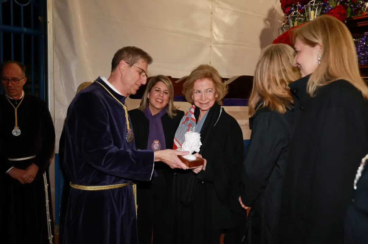 En el interior de la Cofradía de Pescadores, bajo la carpa que resguardaba el trono, la imagen del Nazareno se mostró en toda su solemnidad. Allí, en ese espacio íntimo que precede a la procesión, la Reina escuchó atentamente las explicaciones sobre la historia de la cofradía y el significado de la madrugada del Viernes Santo. Fue un momento pausado, casi recogido, en contraste con la intensidad que ya se intuía en las calles.