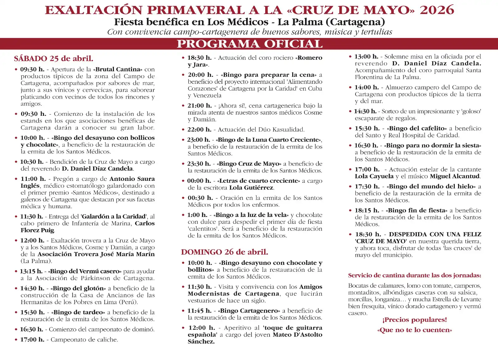 La diputación cartagenera de Los Médicos, la que menos residentes tiene en el municipio de Cartagena, acogerá los días 25 y 26 de abril, próximo fin de semana, una fiesta benéfica y cultural para recaudar fondos destinados a restaurar su edificio eclesiástico, cuyo origen data del siglo XVIII, y para ayudar a entidades solidarias. Los trovos, la variedad de propuestas musicales, la charlas, la visita de los amigos modernistas y los bingos, entre otros, completarán 25 horas de actividades y convivencia aderezada por productos típicos del campo y de la mar.
