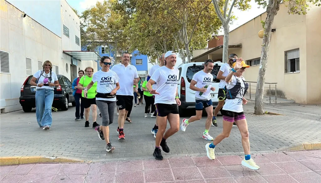 Susi Diaz acompañada por miembros del Club de Atletismo de Torre Pacheco, sanitarios y vecinos, bajo el lema ‘Para cuidar a los demás, primero hay que cuidarse a uno mismo’, ha continuado su desafío deportivo ‘Correcaminos Feliz’, con el que está recorriendo la geografía murciana en 11 etapas uniendo las 50 bases con las que cuenta el 061 en la Región de Murcia.