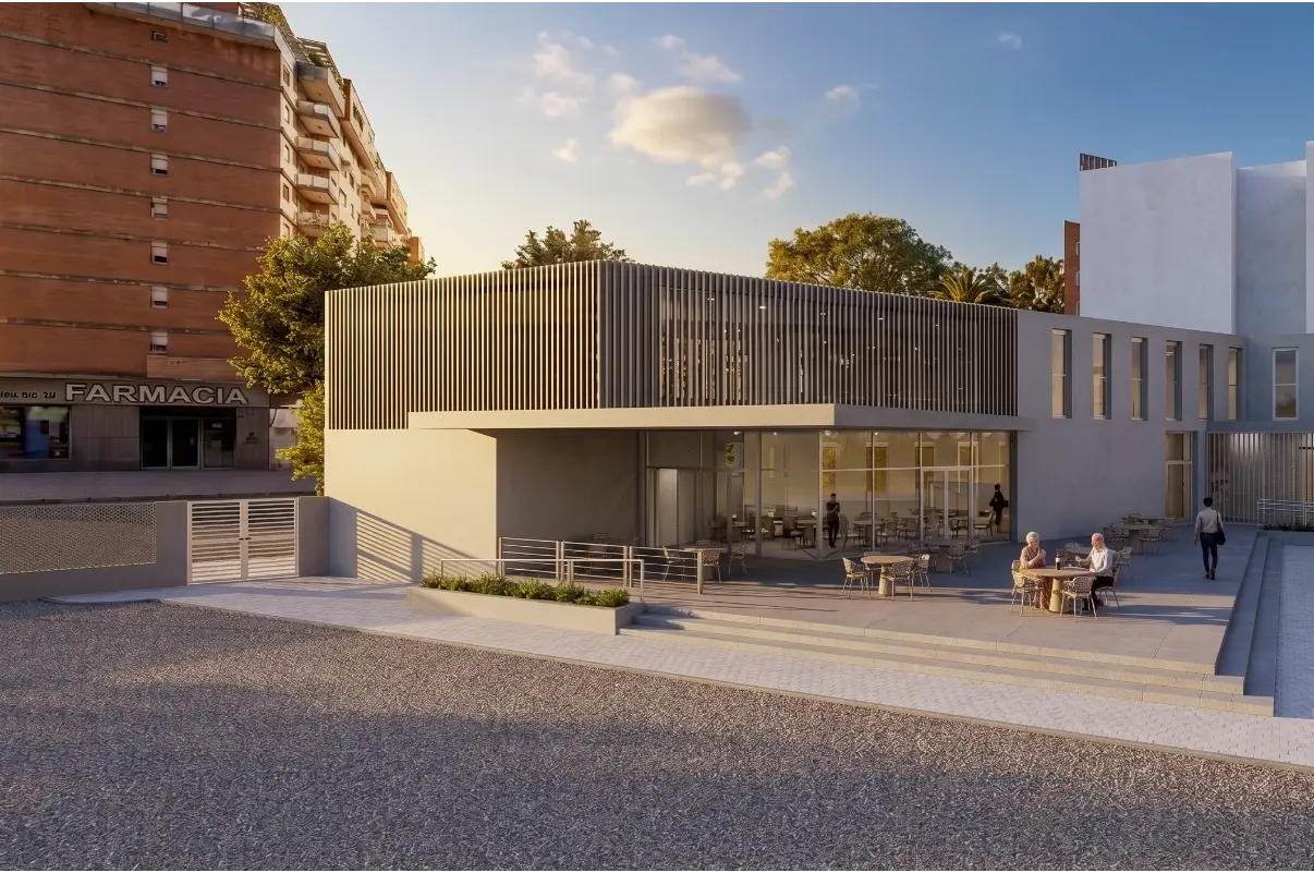 Esa espera, ahora, se traduce en una actuación más ambiciosa. El edificio no solo crecerá en superficie, sino también en posibilidades. La planta baja ganará protagonismo como punto de encuentro cotidiano: una cafetería más amplia, cocina equipada, nuevos baños y una conexión directa con una terraza exterior que abrirá el espacio hacia el parque. Un gran ventanal en esquina aportará luminosidad y una nueva relación visual con el entorno.